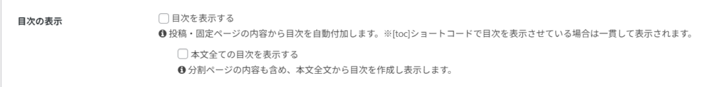 • テーマ設定内に「目次表示」のON/OFFがある